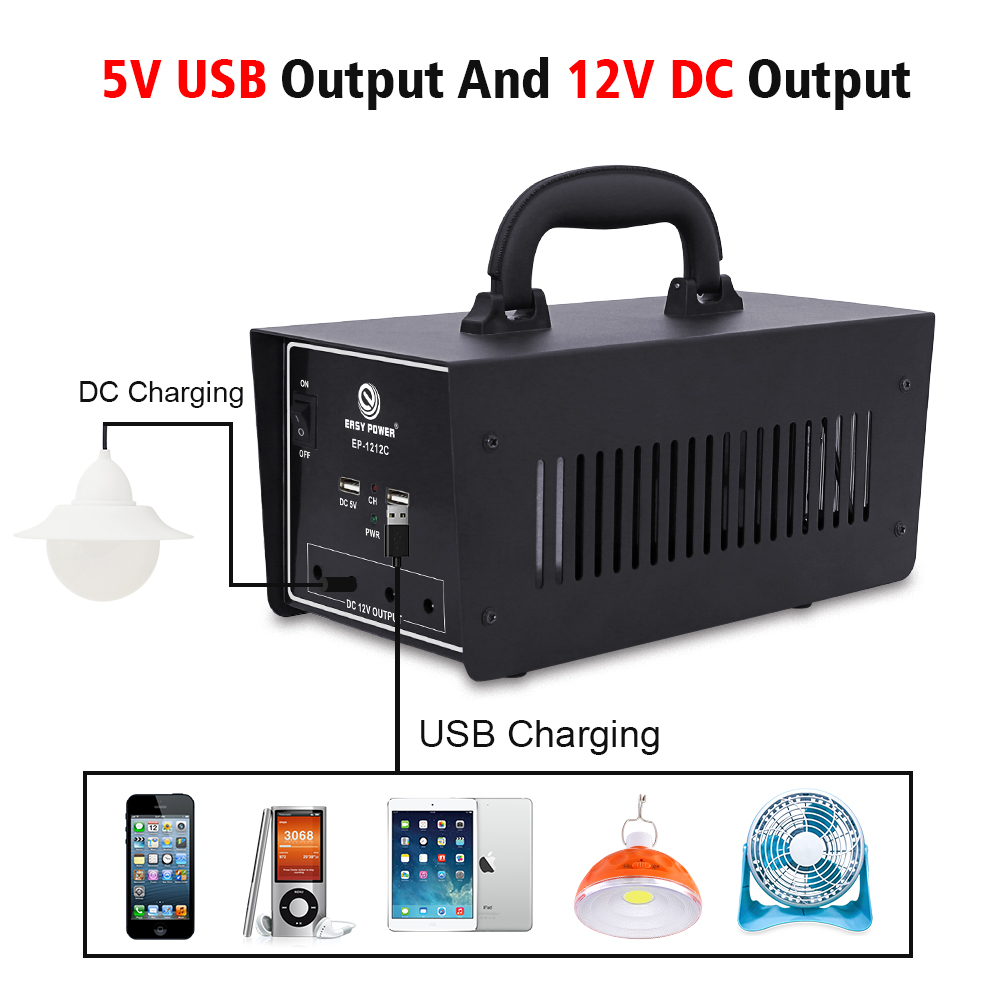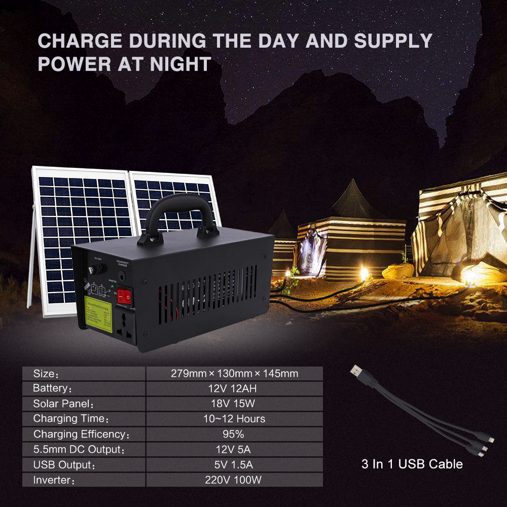 Descrierea produsului: întregul set include o baterie gazdă încorporată 12V 12000mAH plumb acid, 1buc panou solar 18V 15W, 3 buc lampă LED, 1 buc 4 în 1 cablu. 1 buc 12 V cablu de încărcare
